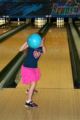 Rowan was cracking us up. She bowled on the same lane with me, my mom, and Shari. She picked the lightest ball possible, but she was still having to heave it back and then whip it around with all her might to get it down the lane. It would crash with a mightly plunk and then oh so slowly roll down the lane, always curving at the last second. Thank heaven for the bumpers they put in the gutters. It was pin ball city for the kids, but it sure makes it fun for them. (Note the mulit-layer ruffled skirt. Very appropriate bowling attire I know. But would you expect anything less from our Rowan?)